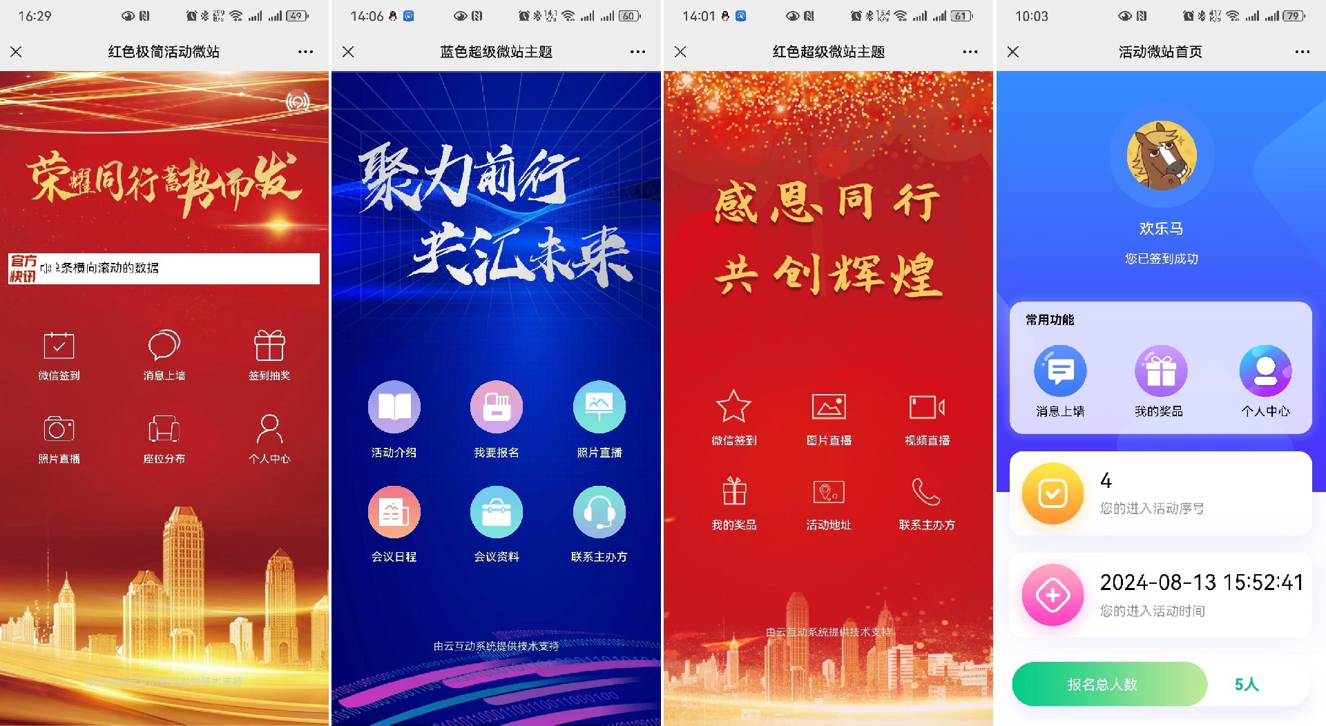 陕西云互动系统最新发布的智能会务超级微站系统已经发布预览版,通过智能会务系统,可以快速搭建智能会议微站平台,实现信息展示、活动签到报名、实时消息互动、现场签到抽奖、会议信息实时输出、中奖信息/座位信息实时查询等互动功能。
