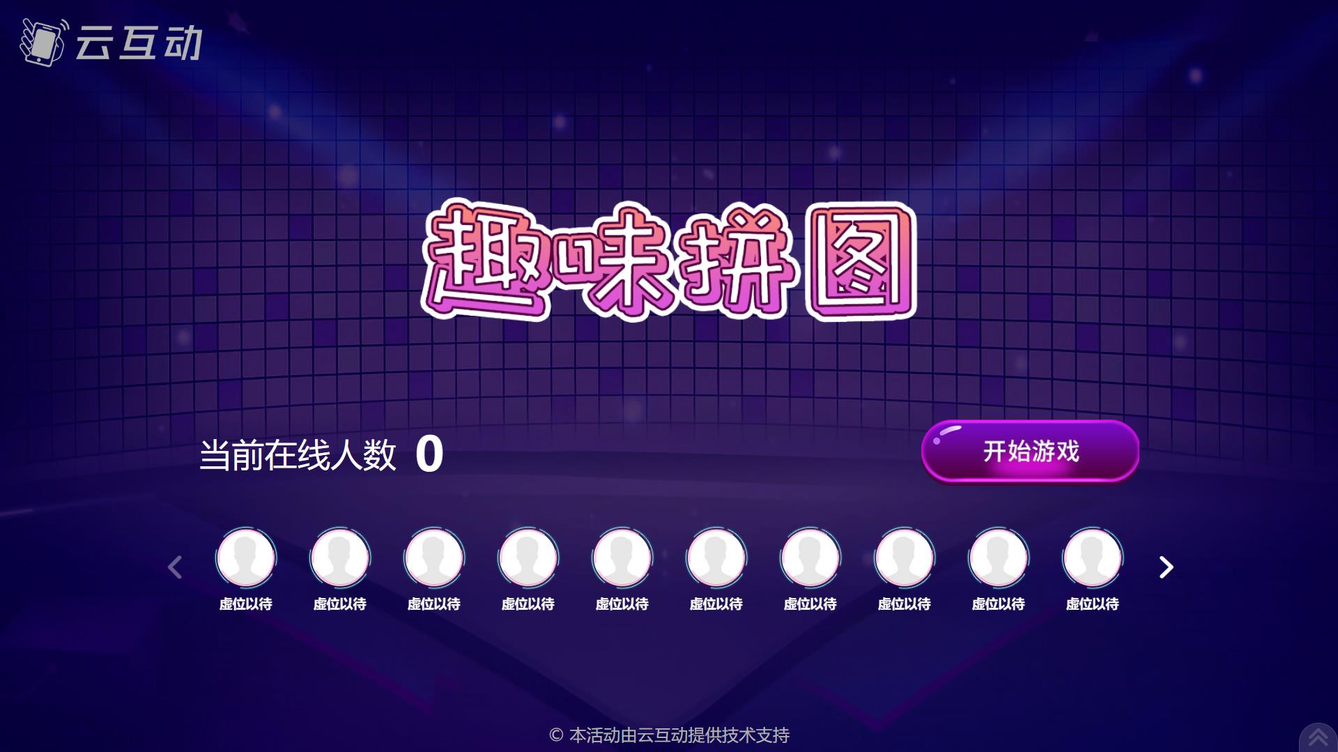 趣味拼图是陕西云互动系统近期推出的现场互动竞技游戏,不同与传统的摇一摇拼手速游戏,趣味拼图是用户在手机端使用手指移动碎片拼成完整的图片参与游戏,大屏幕上实时显示用户得分排行榜,并在倒计时结束后显示排名的互动游戏。玩法新颖,广告植入效果好,因此也很受活动主办方的喜爱。